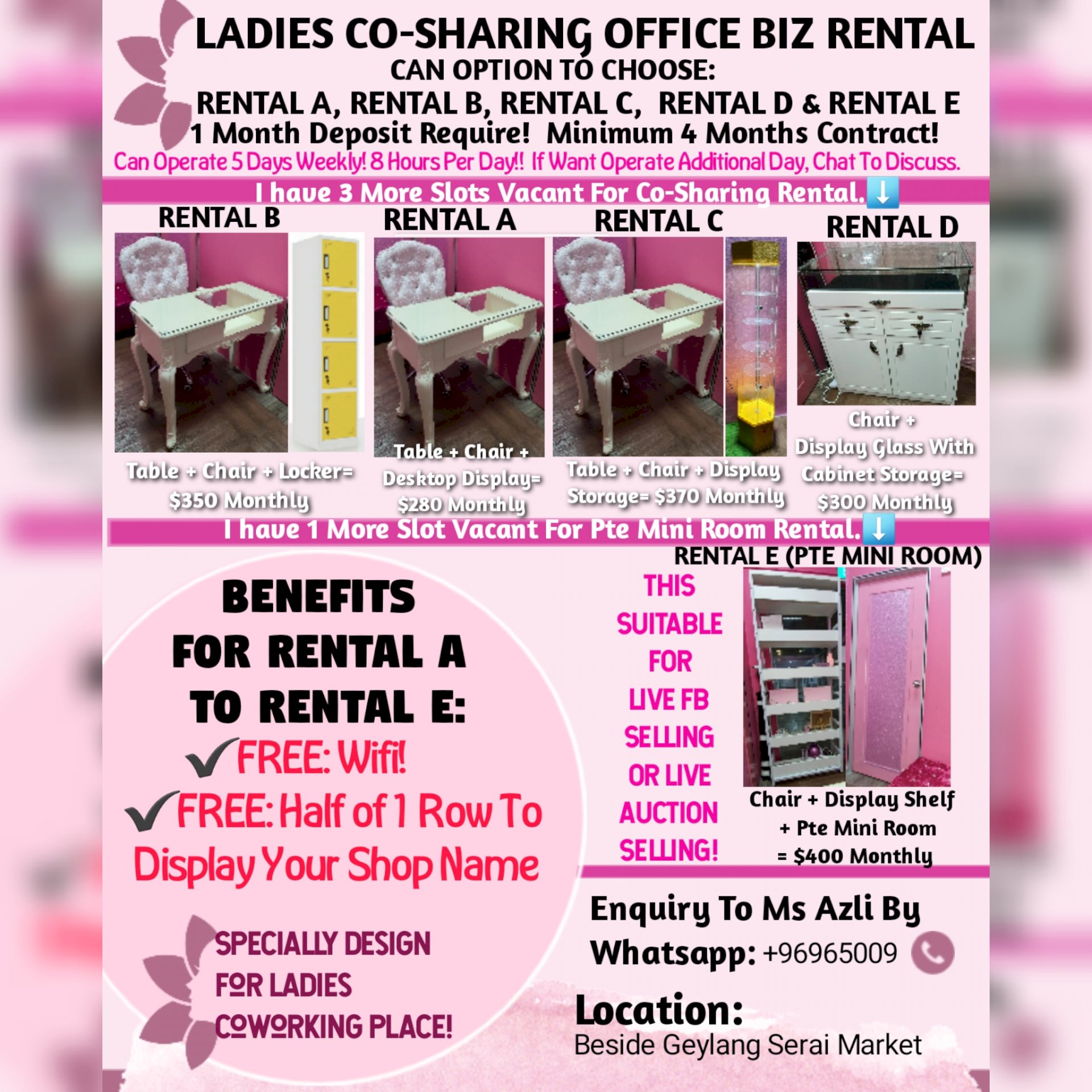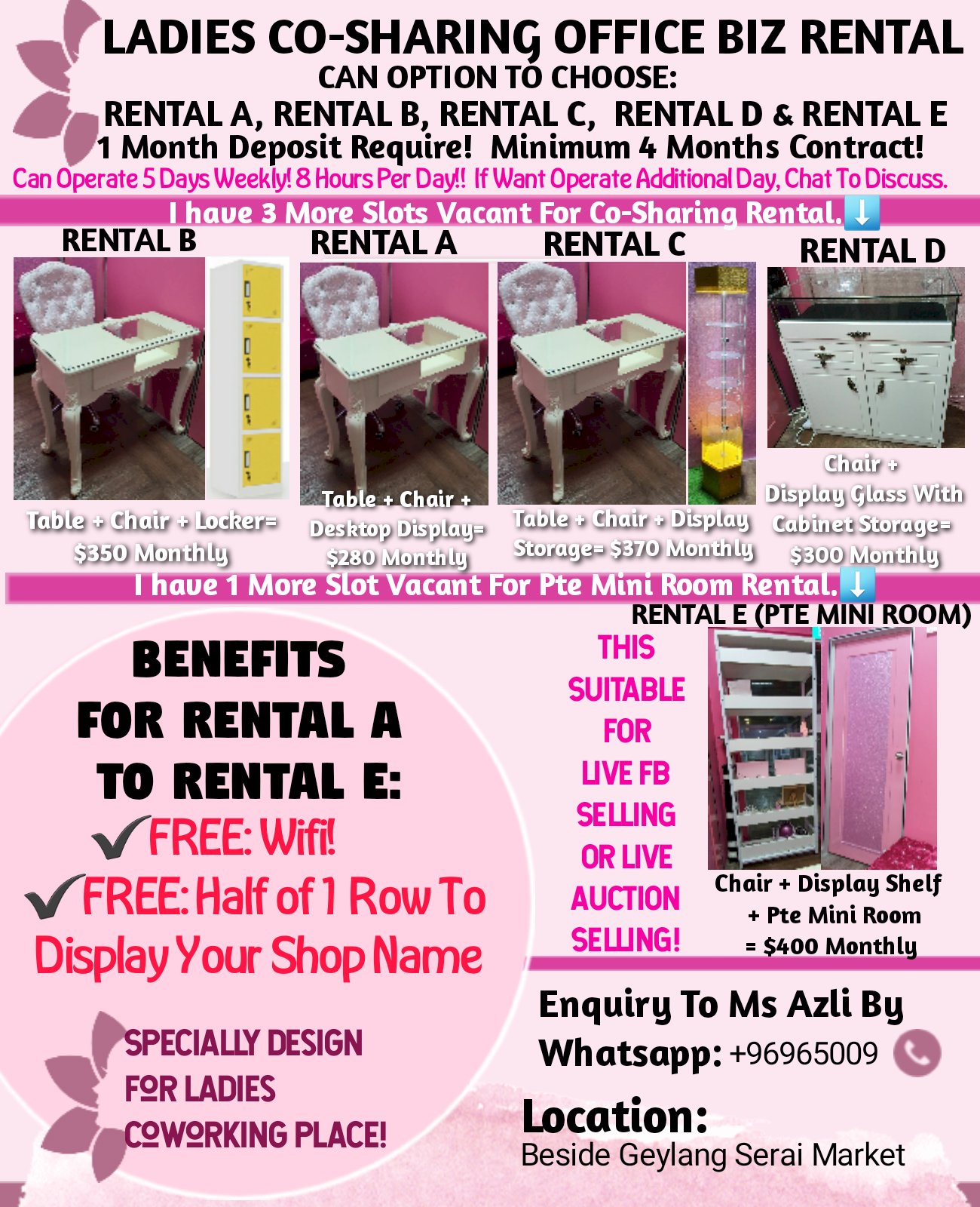 So If You interested in our Co-Sharing Space Rental, do message Admin (Ms Azli) your Quiry by whatsapp Admin @ 96965009