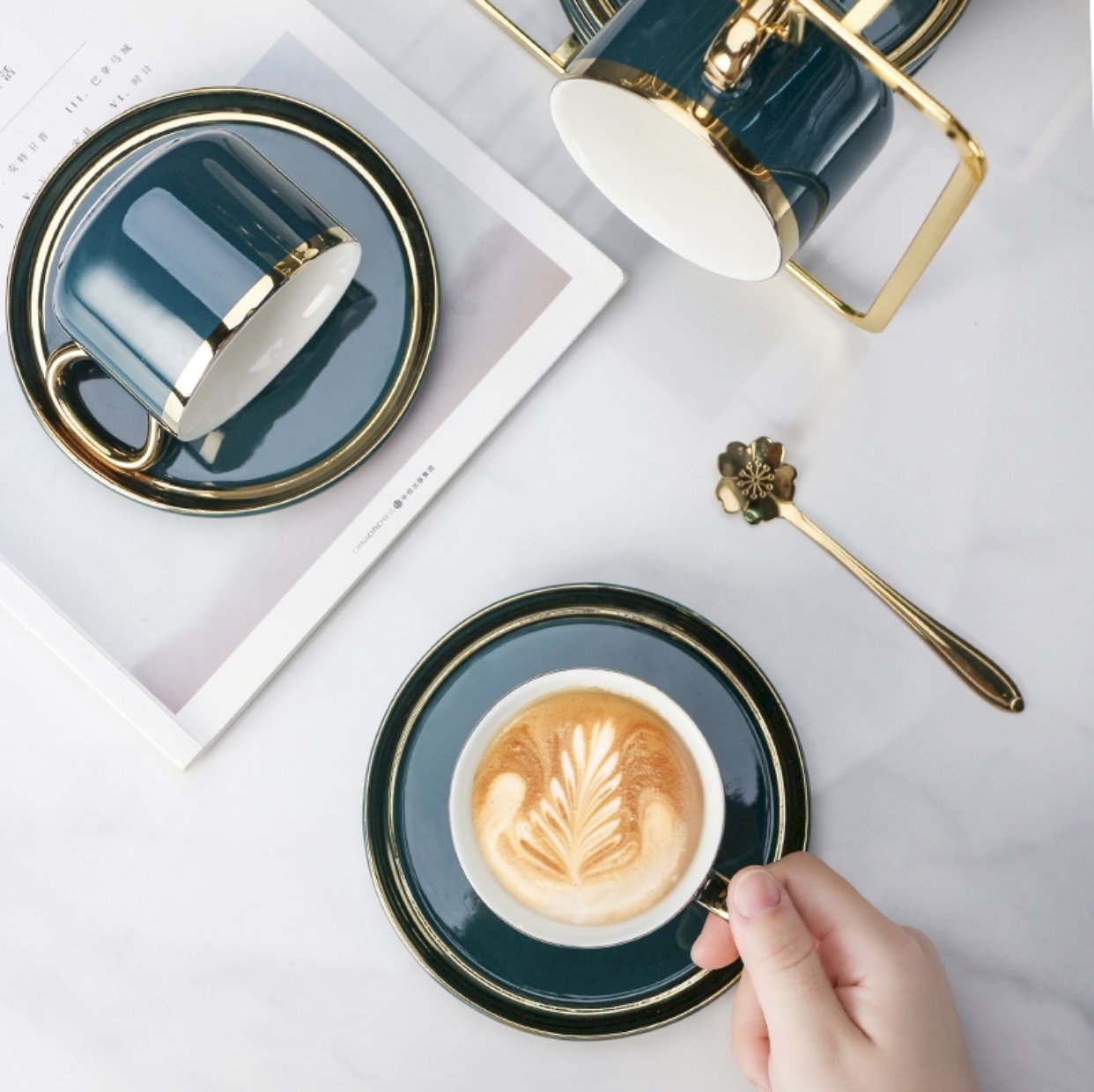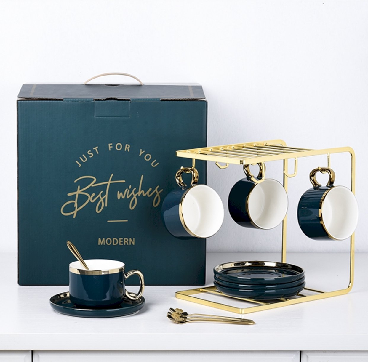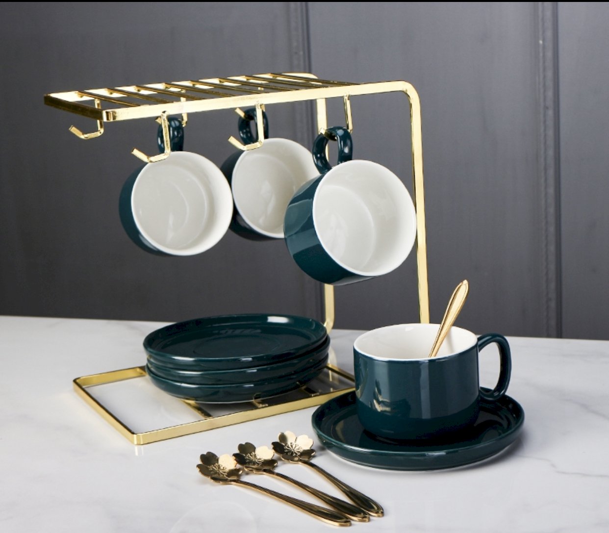 Gorgeous tea cup set that comes with rack, gold spoons, cups and saucer.